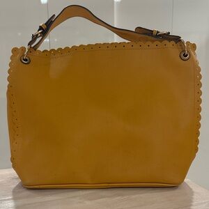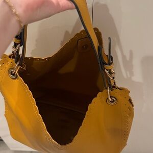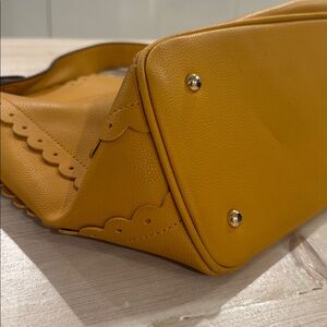 This stylish mustard tote bag is perfect for any occasion. Its vibrant color adds a pop to any outfit. Ideal for daily use, it combines fashion with functionality. The bag measures 17 1/2 inches across the top and 12 1/2 inches tall and 6 1/2 inches across the bottom for depth. There is light where on the bottom of the corners and at interior as shown and reflected and discounted price.