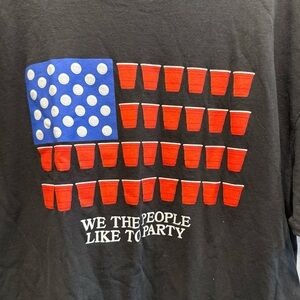 Black tee with red cup and blue polka dot flag design saying ‘we the people like to party’. Ideal for 4th of july festivities or casual wear. Good condition, no noticeable flaws. Rue21 brand, size XL, made of 100% cotton material.