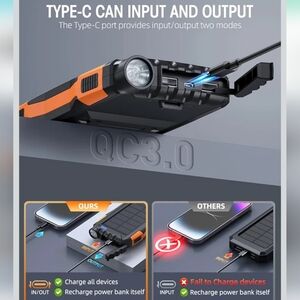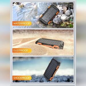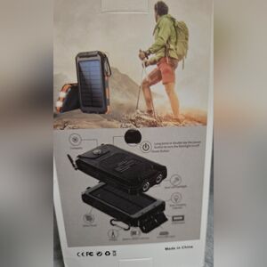 Stay charged anywhere with this portable solar charger. Featuring a sleek black and orange design, it includes an LED flashlight and compass, perfect for outdoor use.