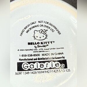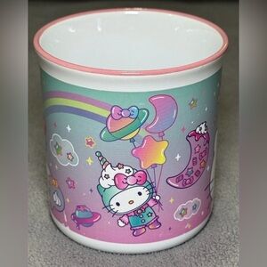 The Sanrio Hello Kitty Rainbow Unicorn Theme 12oz Ceramic Mug is a colorful and whimsical mug featuring a cylinder shape with a painted design of Hello Kitty with rainbows and unicorns. This ceramic mug is medium-sized and can hold hot or cold beverages. With a contemporary style and featuring microwave and dishwasher safe properties, this mug is a perfect addition to any tea or coffee lover's collection. This licensed reproduction from the Hello Kitty franchise by Galerie is a fun and unique piece for teens, unisex adults, and unisex kids alike. Measures 3.5" tall and 3.5" in diameter. Excellent condition.