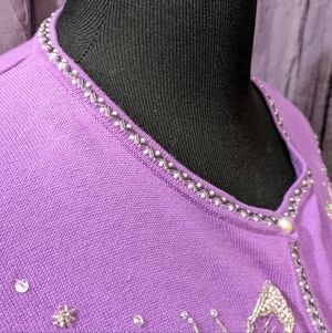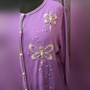 This elegant purple sweater features beautiful dragonfly embellishments, adding a touch of whimsy to your wardrobe. Perfect for any occasion.