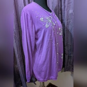 Beaded Dragonfly Embellished Purple Cardigan Sweater 1X