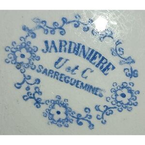 Jardinière U at C Sarreguemines: Vintage / Antique Ironstone French Pitcher - Transferware colors White Pitcher with Blue Flowers.