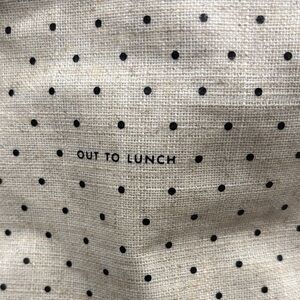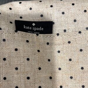 a Kate Spade New York "Out To Lunch" insulated lunch tote in a beige or tan and black polka dot pattern. It features a coated linen exterior, an insulated interior lining, and a top handle for easy transport.