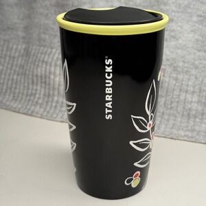 This unique Starbucks 12 oz ceramic tumbler features a bold black background with a stylized white tiger and floral design. It comes with a snug black plastic lid and a bright yellow rim that adds a pop of color. The tumbler is hand-wash only and not microwave safe, making it a great collector's item or everyday companion for your favorite beverages.