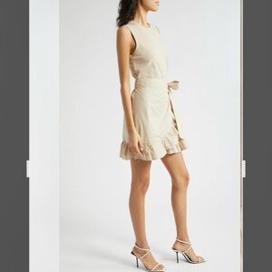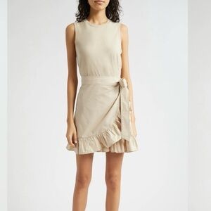 New with tag. The Cinq à Sept Mahlia Dress is crafted from lightweight, low-stretch poplin and features a jersey tank. The sleeveless dress has a crew neck and a faux wrap skirt with a tie closure and ruffle trim. It is unlined. The shell is made of 95% cotton and 5% elastane; the trim is 100% cotton.
