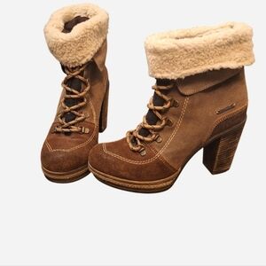 Diesel brand Lace-up Boots with a 3.5" heel and cream color faux fur optional fold down upper rim.