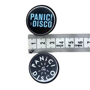Set of 2 Panic! At The Disco logo pins from Hot Topic, measuring 3cm in diameter. Stickers removed from the back but they’ve never been used