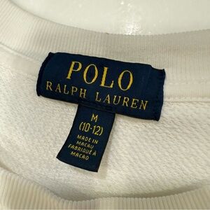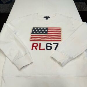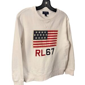 Excellent condition. Polo Ralph Lauren’s Unisex Kids Pullover Sweatshirt W/ Fabric Flag & RL67 logo. 100% cotton. Size M 10-12. Runs big. See photos for measurements. MSRP $130