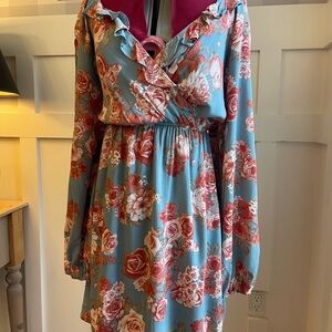 Charming dress featuring a floral pattern and ruffled neckline. Long sleeves add elegance.