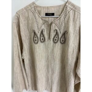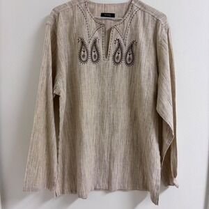 Keywords: mens tunic, paisley embroidery, embroidered shirt, long sleeve top, boho, ethnic, designer, casual wear, travel, resortwear, lightweight, comfortable, unique, artisan