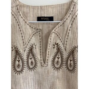 Embrace sophisticated comfort with this Rajavi men's tunic shirt. The rich tan hue is beautifully complemented by intricate dark brown paisley embroidery adorning the neckline, creating a touch of artisanal flair. The textured fabric offers a breathable feel, perfect for layering or wearing on its own. A subtle V-neckline adds a touch of relaxed style, making this top ideal for casual outings or relaxed evenings.