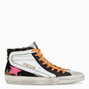 Bold Golden Goose high-tops with vibrant colors. White and black base with pink star and orange laces. Stylish and unique.