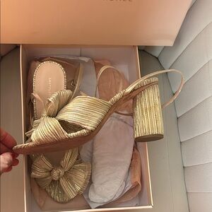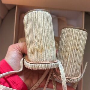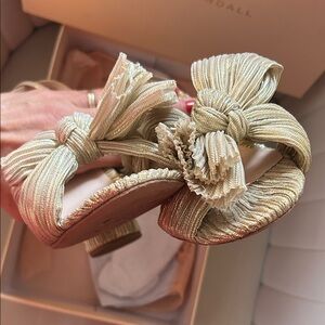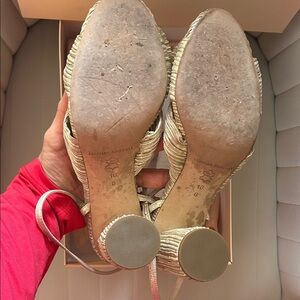 Chic muted gold (color called platinum) heels with pleated design and bow detail. EUC with some minor staining from water on the heels which is unnoticeable when wearing. Size 10 but fits 9W/9.5.