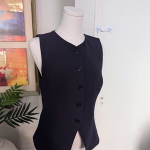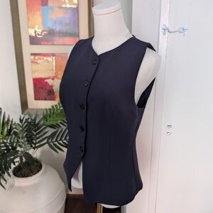 Sleek navy vest. Button-up front. Sleeveless design. Perfect for layering.