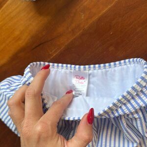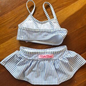Adorable kids bikini with ruffle details. Blue and white stripes. Pink polka dot bow accent. Worn twice