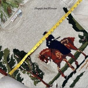 Very rare intarsia equestrian hunter motif crewneck sweater in an oversize cotton blend is perfect with baggy jeans. VGUC. Size medium fit could also accommodate a large based on fit preferences.
