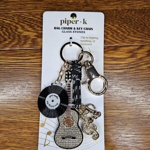 Piper K Music Guitar bag charm and keychain featuring glass stones, a record that says "You make my heart sing," and gold-toned music notes.