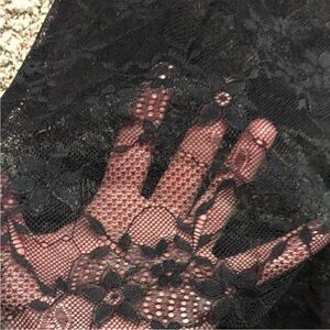 Chic black lace pants with a stylish flare. Perfect for a night out.