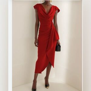 This stunning black dress features an asymmetrical wrap design with a chic one-shoulder neckline, perfect for cocktail events. The sleeveless sheath silhouette elegantly contours the body, offering a sophisticated and modern look.