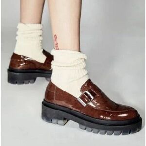 Make a bold statement with these Free People Mackenzie MJ Patent Leather Loafers in rich chocolate brown. Designed with Free People’s signature modern-boho aesthetic, these chunky loafers combine vintage-inspired Mary Jane charm with edgy, fashion-forward detailing — the perfect pair to elevate any outfit.