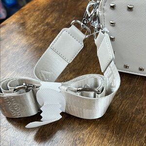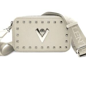 Elegant white crossbody bag with silver studs. Features signature Valentino Orlandi logo. Adjustable strap for comfort. Elevate your style with the Valentino Orlandi Light grey Studded Women's Bag. This chic accessory features a sleek design with studded accents, perfect for any occasion.