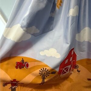 Sky blue dress with cloud pattern. Mustard hem with farm scene. Sleeveless and stylish. With pockets