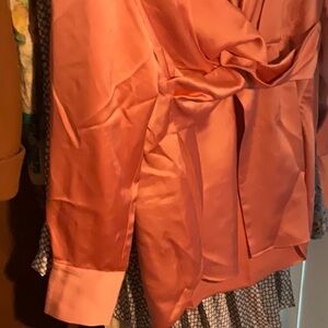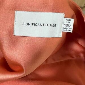 Elegant coral satin dress by Significant Other. Perfect for any occasion.