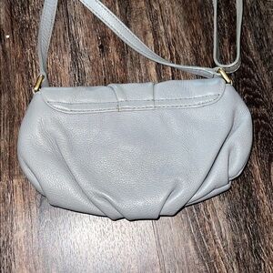 Elegant gray leather bag featuring a gold-tone nameplate. Perfect for everyday use.