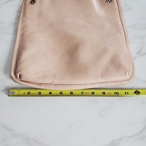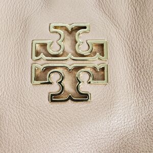 Tory Burch Pink Leather Britten Shoulder Bag in GOOD pre-owned condition. The most wear is evident on bottom edges **please see all pictures** Still a stunning purse with its gold chain straps and super big iconic double T across the pale pink bag. Pebbled leather, solid light shell pink, medium-sized, rectangular shape, gold hardware accents. One zippered pocket. Bag itself measures 12x11x1 and 23" in length when including strap. Smoke-free home. Ships today or next business day.