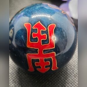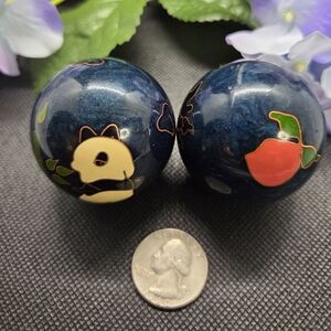 Also called Baoding balls, each chimes a slightly different tone as you roll them in your hands. Metal with a deep blue enamel, they feature a panda with bamboo and a peach and Chinese character.