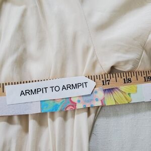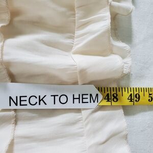 This elegant cream maxi dress offers a timeless and sophisticated look. Perfect for any occasion, it features a flattering silhouette and delicate details. Covered buttons and tie neckline. Cotton polyester blend. In really nice condition. Please see photos for measurements.