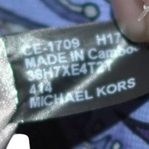 Add a pop of personality to your wardrobe with this Michael Kors Emry Paisley Leather Medium NS Tote in navy blue whimsical print. Crafted from durable leather, this versatile bag features a detachable crossbody strap for hands-free convenience and dual top handles for classic carry. Inside, you’ll find a spacious main compartment, one large zippered pocket, and four slip pockets to keep your essentials organized. Perfect for everyday use or as a stylish travel companion.