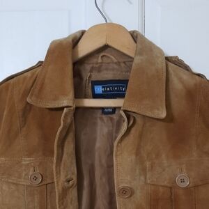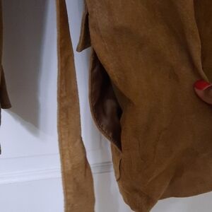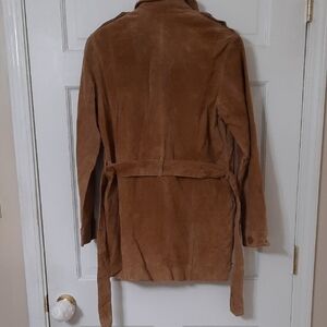 Elegant brown suede jacket with button closure. Shirt collar with button down front. loops along waiat for unattached suede belt. Polyester lining. Features multiple front pockets, side pockets and an inside pocket for phone. Perfect for a classic look.