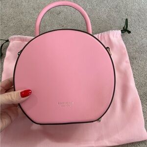 Elegant mini circle bag in blush pink. Features a top handle and signature logo detail. Perfect for adding a pop of color.