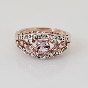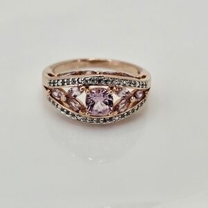 This elegant ring is crafted of sterling silver with 18k rose gold overlay. The center gemstone is a cushion cut color shift garnet and the other garnets are marquise shaped in a dainty design. The total carat weight is just over 2 carats. The garnets shift from a dark rose to a champagne blush and it even turns into a lavender color. It's a gorgeous ring with added garnets on the top of the band. It is stamped by designer and 925. New with original box. Size 7.5!