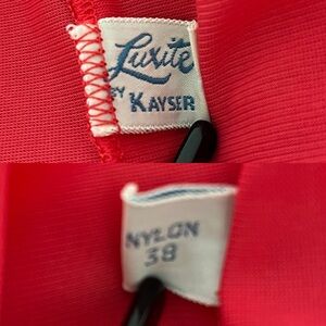Vintage Luxite by Kayser full slip in red with lace trim around top front, sides, back and under bust. Ribbed fabric on ruffle hem and lace trim. Adjustable straps. 100% nylon.
