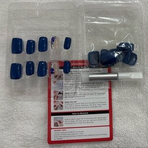 Experience salon-quality nails at home with Blue Gel Press-On Nails. 20 nails of the 30 left. The small and large sizes. Everything you see in the picture you get except the semi permanent glue in the black tube. I showed that because that’s the glue I like that makes my nails last 2 weeks. The last pictures are of the 10 I used of my nails. Easy to apply and long-lasting, these nails offer a stunning blue finish for any occasion.