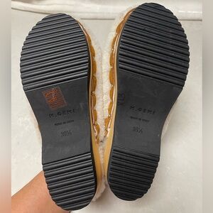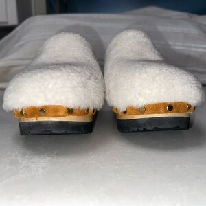 Wood sole with EVA bottom (meaning: lightweight, cushioned, and no clunky noises when walking)