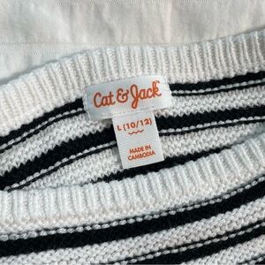 Chic knitted Girl’s top with black and white stripes. Sleeveless design. Perfect for layering or wearing alone.