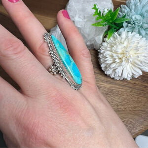 Solid Sterling Silver 925 Turquoise Ring Size 7 Long Boho Southwest Blue New