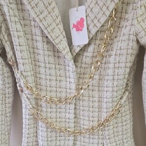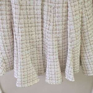 Stylish white tweed dress with shimmering gold details. Ideal for a chic ensemble.