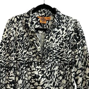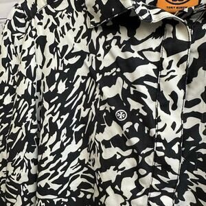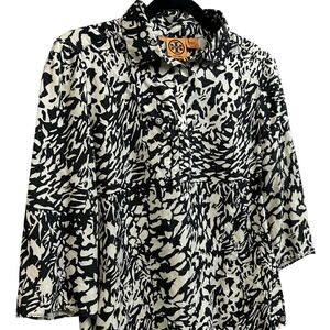 Tory Burch Black White Patterned 100% Silk T Logo Tunic Blouse Size 6