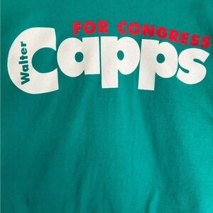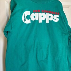 Comfortable teal shirt with bold lettering, perfect for casual wear. Walter Capps for Congress 1996 Avila Beach, California benefit concert featuring Bonny Raitt, Jackson Browne and Don Henley. Mock turtle neck collar. Good vintage condition with some wear, but very bright colors.