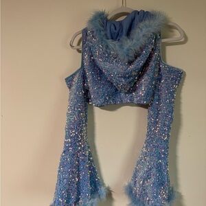 Shimmer in this glittery blue dance costume. Features soft fur accents for added flair. Ideal for performances.