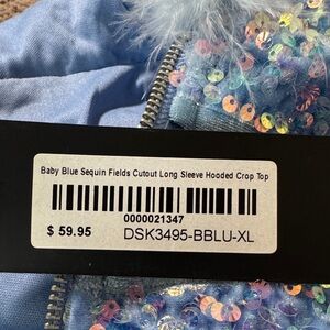 RAVE WONDERLAND Baby Blue Sequin Cutout Long Sleeve Hooded Crop Top