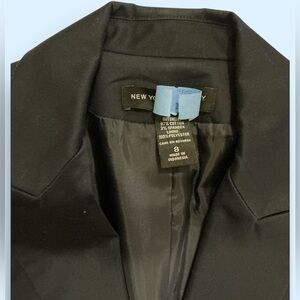 Sleek black stretch blazer and matching dress pants by New York & Company, size 8 Tall—tailored for a polished, professional look with a comfortable fit.