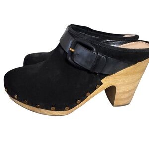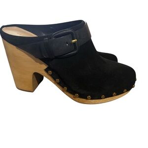Chic Veronica Beard black suede clog mules featuring a classic wooden platform heel, studded trim, and adjustable buckle strap. Effortless slip-on style that pairs perfectly with denim, trousers, or dresses. Elevated yet comfortable — ideal for everyday wear or polished casual looks.