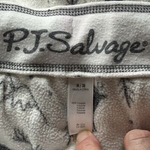 PJ Salvage Fleece pajamas moose outdoor scene print, size M. Long sleeves. Red drawstring on pants. Gray and white moose outdoors print throughout.
