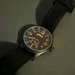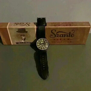 Szanto Time Vintage Style, men’s watch. Black leather band, wear damage as pictured. Needs new battery. Original box included.